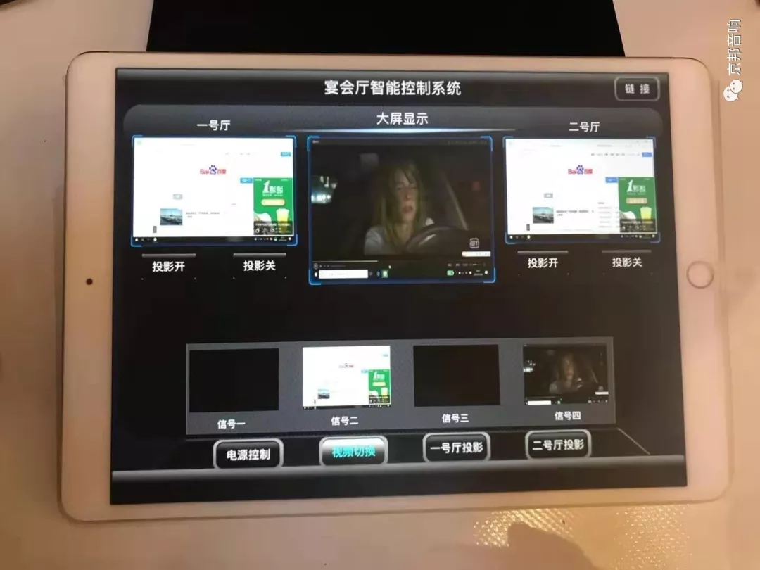 中控系統(tǒng):為了宴會(huì)廳內(nèi)各系統(tǒng)設(shè)備的順利使用和管理,采用中央控制系統(tǒng)進(jìn)行統(tǒng)一管理和控制。通過中央控制系統(tǒng)來控制顯示屏、DVI矩陣、音頻矩陣切換器、音響系統(tǒng)等所有設(shè)備的電源開關(guān),顯示屏等信號(hào)切換以及DVD、攝像機(jī)等各種視頻信號(hào)切換。可通過單鍵實(shí)現(xiàn)多種功能同時(shí)動(dòng)作。