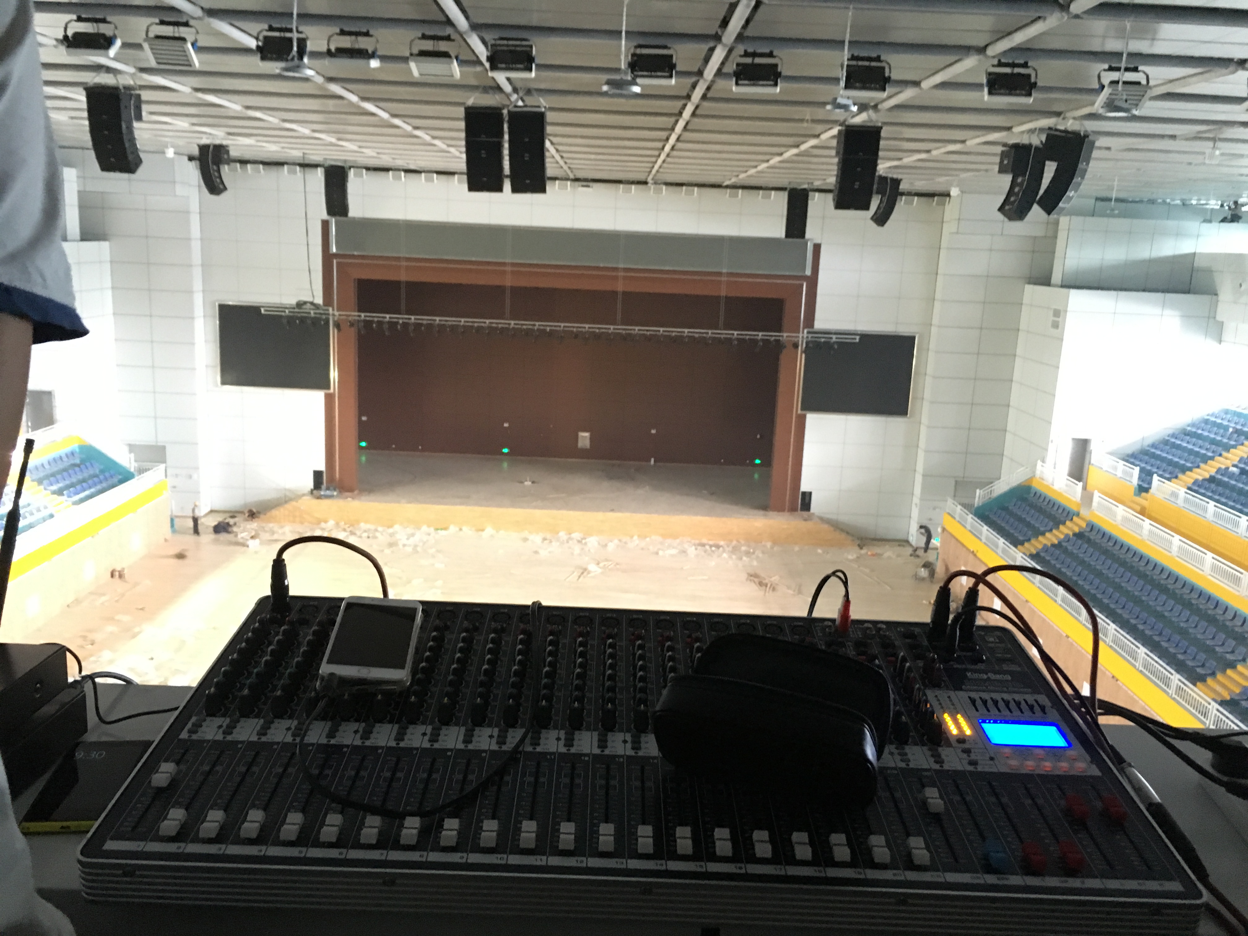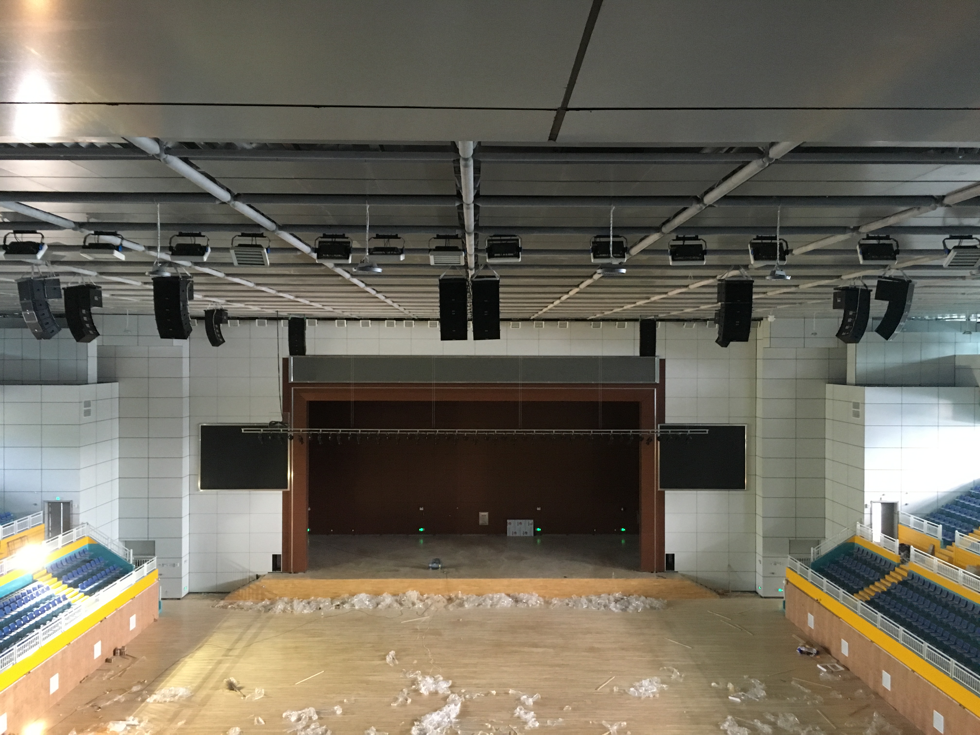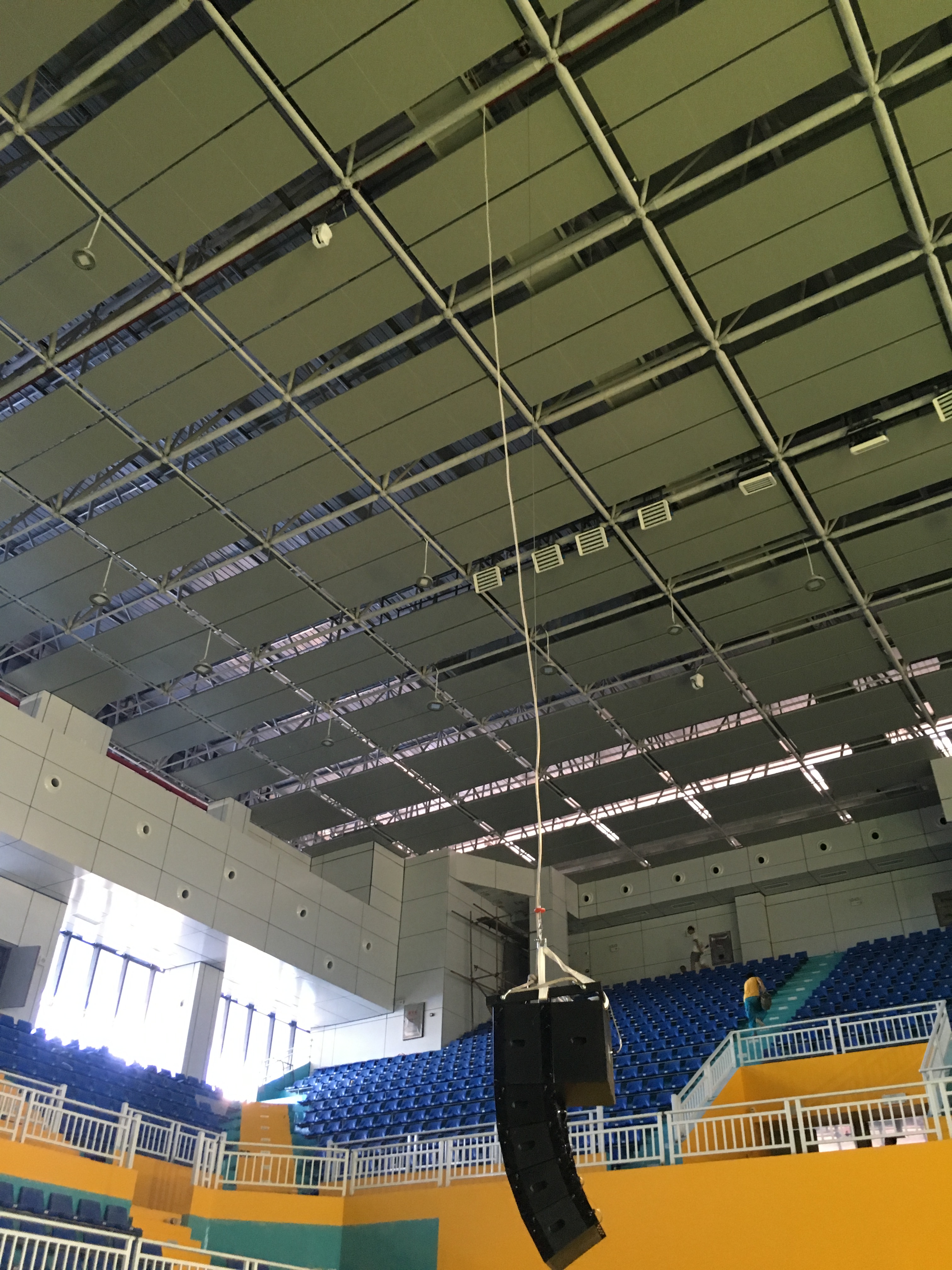 在體育館的左右兩側(cè)分別裝了2只KS-218雙18寸線性陣列-低音炮,16只KS-208雙8寸線性陣列-全頻,10只KS-118線性陣列-低音炮做為主擴系統(tǒng)。