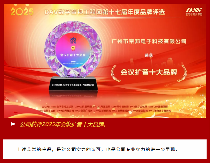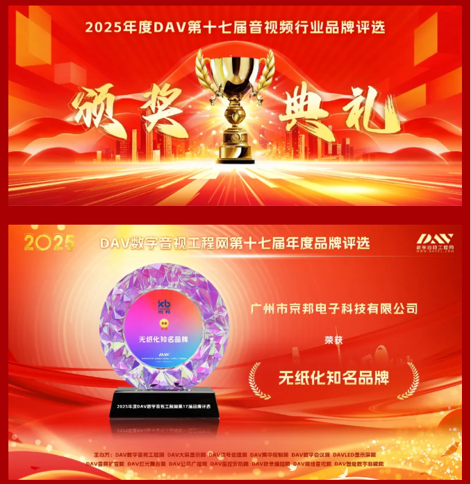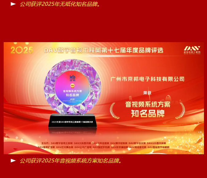 【喜報(bào)】京邦電子榮獲2025年度DAV數(shù)字音視工程網(wǎng)三大權(quán)威獎(jiǎng)項(xiàng),助力贏得市場(chǎng)矚目